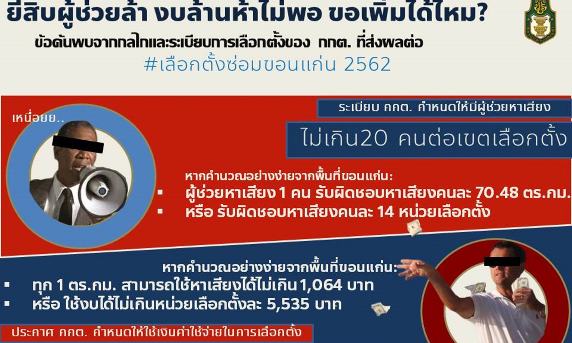 ข้อกฎหมายสำคัญที่จะนำมาพิจารณาในประเด็นนี้คือ “ประกาศคณะกรรมการการเลือกตั้ง เรื่อง กำหนดจำนวนเงินค่าใช้จ่ายในการเลือกตั้งส.ส. พ.ศ.2561” ในข้อ 8 งบประมาณที่ผู้สมัครแบบแบ่งเขตสามารถใช้ได้ในช่วงเลือกตั้งแทนตำแหน่งที่ว่าง จำกัดงบอยู่ที่ 1,500,000 บาทเท่านั้น โดยหากนำมาคำนวณอย่างง่ายที่สุดตามข้อจำกัดขนาดพื้นที่จริง เขตเลือกตั้งจังหวัดขอนแก่น เขต 7 นั้น มีหน่วยเลือกตั้งทั้งหมด 271 หน่วย และพื้นที่รวมทั้งสิ้น 1,409.6 ตร.กม. ด้วยงบประมาณที่จำกัดไว้ที่ 1,500,000 บาท เท่ากับว่าโดยเฉลี่ยแล้ว ผู้สมัครสามารถใช้งบประมาณหาเสียงต่อบริเวณ 1 หน่วยเลือกตั้งได้ไม่เกินหน่วยเลือกตั้งละ 5,535 บาท หรือเฉลี่ยต่อทุก 1 ตร.กม. สามารถใช้งบประมาณหาเสียงได้ไม่เกิน 1,064 บาท เท่านั้น