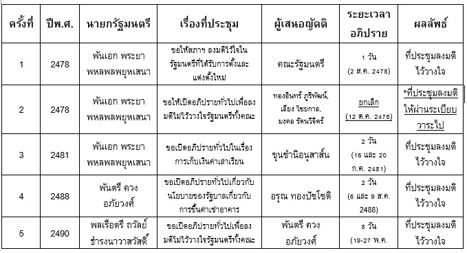- ครั้งที่ 1 การอภิปรายในยุคพันเอก พระยาพหลพลพยุหเสนา พ.ศ. 2478