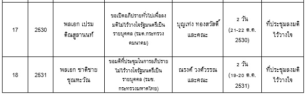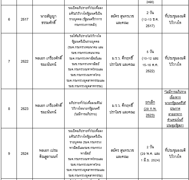- กรณีที่ไม่ได้มีการลงมติข้างต้น มี 4 ครั้งเกิดขึ้นในยุคเปรม (ครั้งที่ 11, 12, 13 และ16) แสดงให้เห็นถึงความพยายามในการล็อบบี้ที่มากเป็นพิเศษต่างจากสมัยรัฐบาลอื่น?