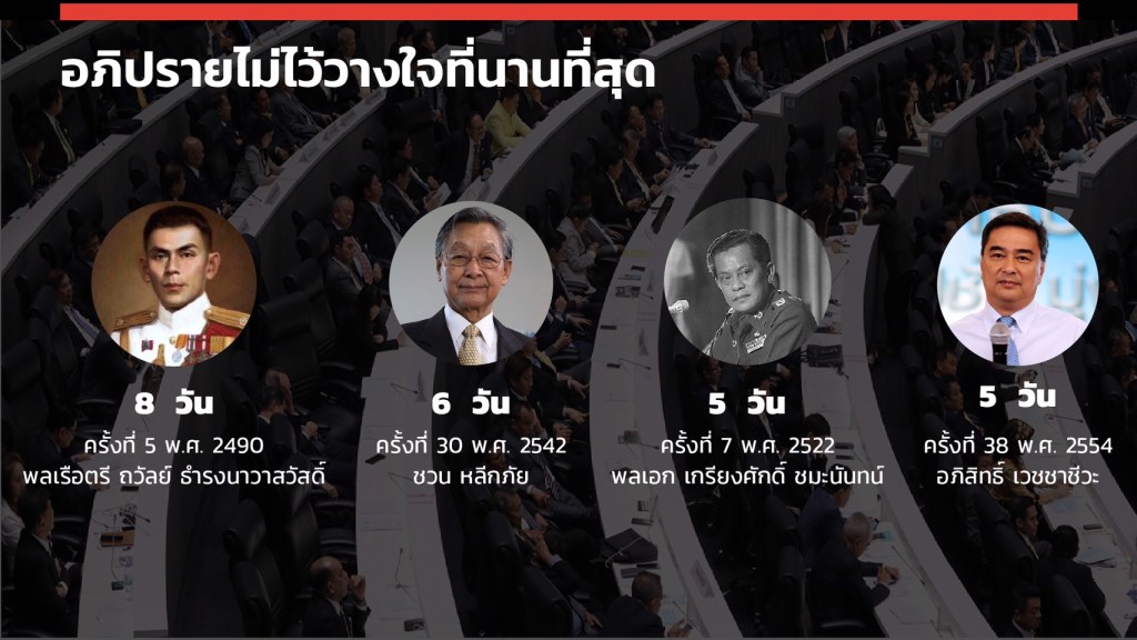 - อันดับที่ 1 ยาวนาน 8 วัน คือ การอภิปรายไม่ไว้วางใจครั้งที่ 5 ในยุคของรัฐบาลพลเรือตรี ถวัลย์ ธำรงนาวาสวัสดิ์