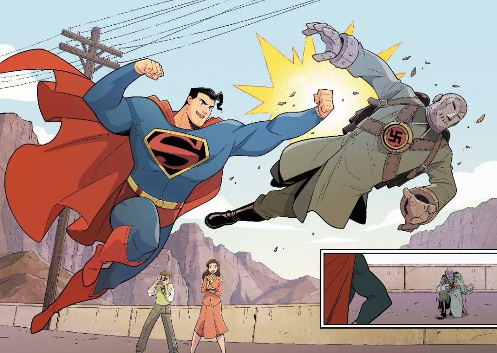 ซุปเปอร์ฮีโร่มักจะมีความผูกพันกับสภาพสังคมไม่มากก็น้อย โดยเฉพาะกรณี Marvel Comics สมัยที่สงครามเย็นร้อนระอุ Marvel ได้ผลิตซุปเปอร์ฮีโร่เพื่อตอบสนองต่อสถานการณ์บ้านเมืองทั้งในและระหว่างประเทศ ไม่ว่าโทนี่ สตาร์คที่มีเหตุให้กลายเป็นซุปเปอร์ฮีโร่สวมเกราะเพราะถูกลักพาตัวโดยเวียดกง ทั้งยังมีตัวร้ายที่มีความยึดโยงกับคนจีนซึ่งขณะนั้นเป็นคอมมิวนิสต์อย่างแมนดาริน หรือแฟนตาสติกโฟร์ได้พลังพิเศษจากการขึ้นไปสำรวจอวกาศในช่วงที่โซเวียตเริ่มมีความก้าวหน้าทางอวกาศ แต่กลับกัน DC Comics กลับพยายามแยกการ์ตูนกับการเมืองออกจากกัน แม้จะมีบางครั้งที่การเมืองเข้าไปยุ่งก็ตาม ในบรรดาข้อยกเว้นเหล่านั้นก็คือ การ์ตูนเรื่อง Superman Smashes the Klan
