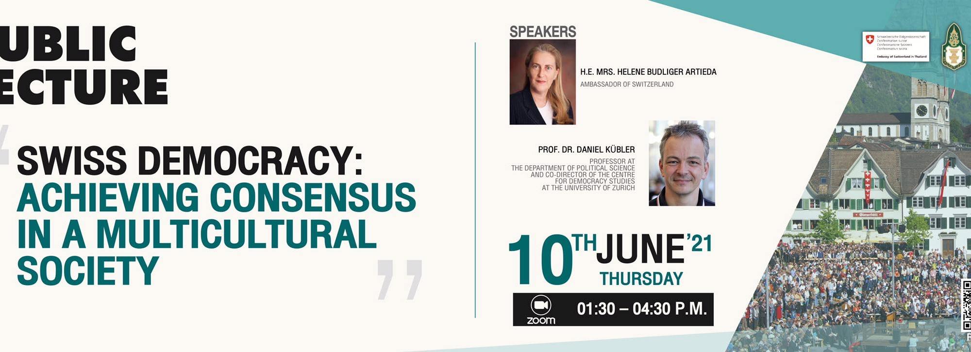 เมื่อวันพฤหัสบดีที่ 10 มิถุนายน 2564 ณ ห้องประชุมประชาธิปก สถาบันพระปกเกล้า ทางด้านสถาบันพระปกเกล้า และด้วยความร่วมมือจากสถานทูตสวิตเซอร์แลนด์ และ Research Center on Direct Democracy ได้จัดกิจกรรมร่วมกันคือ เวทีสัมมนาสาธารณะ เรื่อง “ประชาธิปไตยในสวิตเซอร์แลนด์: ฉันทามติในสังคมภายใต้ความหลากหลายทางวัฒนธรรม” เพื่อเป็นการบรรยายให้ความรู้และแลกเปลี่ยนความคิดเห็นสาธารณะในประเด็นของการเสริมสร้างประชาธิปไตยทางตรงผ่านการเรียนรู้จากประสบการณ์ของประเทศสวิตเซอร์แลนด์
