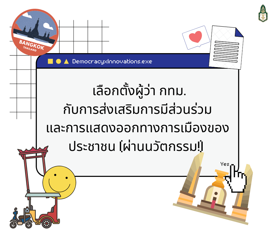 ทางสำนักนวัตกรรมเพื่อประชาธิปไตยจึงได้ไปค้นคว้าและตกผลึก ตลอดจนแสวงหาความร่วมมือกับเครือข่ายต่าง ๆ เพื่อผลิตเป็นแพลตฟอร์ม แอพลิเคชั่น หรือ เว็ปไซต์เพื่อให้ประชาชนได้ลองใช้ และเห็นถึงความสำคัญของการมีส่วนร่วมทางการเมือง เราจึงได้รวบรวมเครื่องมือที่เป็นนวัตกรรมทางการเมืองเท่าที่มีและเป็นประโยชน์ต่อการเลือกตั้งผู้ว่าราชการกรุงเทพมหานครในครั้งนี้ไว้ที่นี้