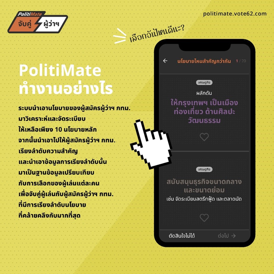 PolitiMate (โพลิติเมต) คือ Voting Advice Application หรือแอปพลิเคชั่นที่จะมาทำหน้าที่เป็นตัวช่วยในการตัดสินใจลงคะแนนเสียงเลือกตั้งของคุณในการเลือกตั้งผู้ว่าราชการกรุงเทพมหานคร โดยเป็นการให้ผู้เล่นได้เลือกจัดลำดับความสำคัญของนโยบายหรือประเด็นที่แสดงขึ้นมา 2 ประเด็น ว่าเห็นว่าประเด็นใดสำคัญกว่ากัน โดยทางเราได้ทำการดึงมาจากนโยบายที่ผู้สมัครต่าง ๆ นั้นเสนอมาในการหาเสียงเลือกตั้ง และสอดคล้องกับยุทธศาสตร์กรุงเทพ 20 ปี จัดทำมาเป็น 10 ประเด็น และให้ผู้สมัครต่าง ๆ ได้เล่น เพื่อเก็บข้อมูลของผู้สมัครนั้น ๆ และจึงเปิดให้สาธารณชนเล่นเพื่อลองดูว่า หากให้ความสำคัญกับนโยบายแบบนี้ จะจับคู่ได้กับผู้สมัครคนไหน กี่เปอร์เซ็นต์ ลองเล่นได้ที่ https://politimate.vote62.com/