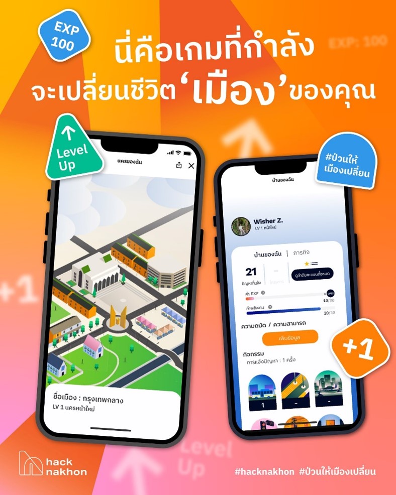 แฮ้คนครจึงไม่ได้เป็นเพียงศูนย์ร้องเรียนผู้ประสบภัยการใช้ชีวิตช้ำ ๆ ในเมืองกรุง แต่เราได้นำแนวคิด ‘Gamification’ มาใช้ พูดอย่างง่ายคือการทำให้มันมีความเป็นเกมมากขึ้น เพื่อให้ทุกคนสนุกกับมันได้ทุกวัน ได้เก็บเลเวล ได้สร้างเมืองในโลกเสมือนและสร้างเมืองที่ดีกว่าในโลกความจริงไปพร้อมกับเรา และเมื่อคุณสะสมปัญหาที่เจอจนครบ 20 ครั้ง จะปลดล็อกเควสเพื่อเข้าสู่โลกเสมือนได้ เมื่อเข้าไปในเมืองได้ คุณจะพบกับฟีเจอร์ต่างๆ ที่น่าสนใจคร่าวๆ ประมาณนี้