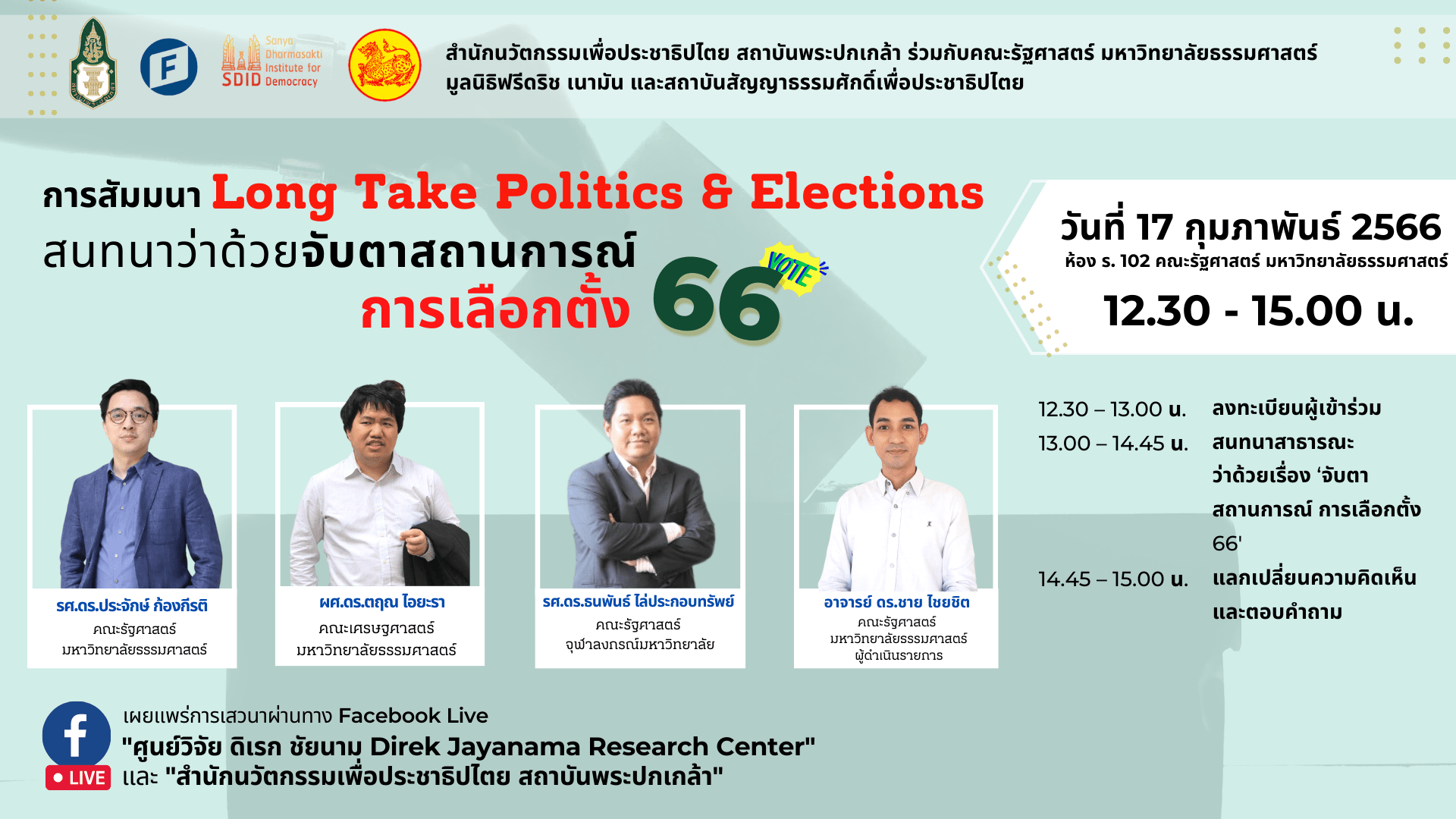 การเลือกตั้งปี 66 ใกล้เข้ามาแล้ว หลายคนคงจะสงสัยว่าการเลือกตั้งในครั้งนี้มีความแตกต่างจากการเลือกตั้งในปี พ.ศ. 2562 อย่างไรบ้าง การเมืองแบบบ้านใหญ่จะกลับมาจริงหรือไม่ และ voter จะเลือกใคร เวทีสัมมนาสาธารณะ “Long Take Politics & Elections: สนทนาว่าด้วย จับตาสถานการณ์ การเลือกตั้ง 66” ได้พยายามหาคำตอบนั้น