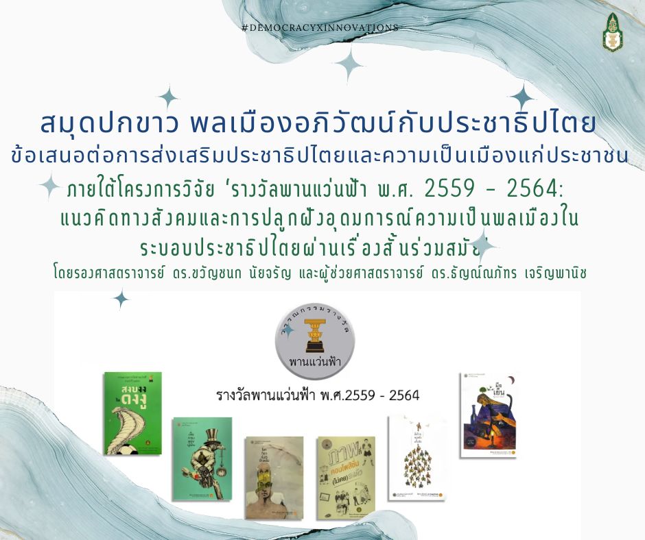 ภายใต้โครงการวิจัย ‘รางวัลพานแว่นฟ้า พ.ศ. 2559 – 2564: แนวคิดทางสังคมและการปลูกฝังอุดมการณ์ความเป็นพลเมืองในระบอบประชาธิปไตยผ่านเรื่องสั้นร่วมสมัย’ โดยรองศาสตราจารย์ดร.ขวัญชนก นัยจรัญ และผู้ช่วยศาสตราจารย์ ดร.ธัญณ์ณภัทร เจริญพานิช