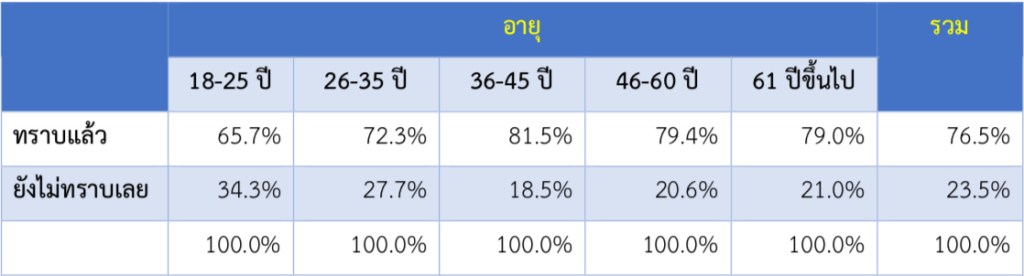 - ผู้ตอบเพศหญิงที่ระบุว่ายังไม่ทราบ (ร้อยละ 27.2) มีสัดส่วนสูงกว่าผู้ตอบเพศชายที่ระบุว่ายังไม่ทราบ (ร้อยละ 19.5)
