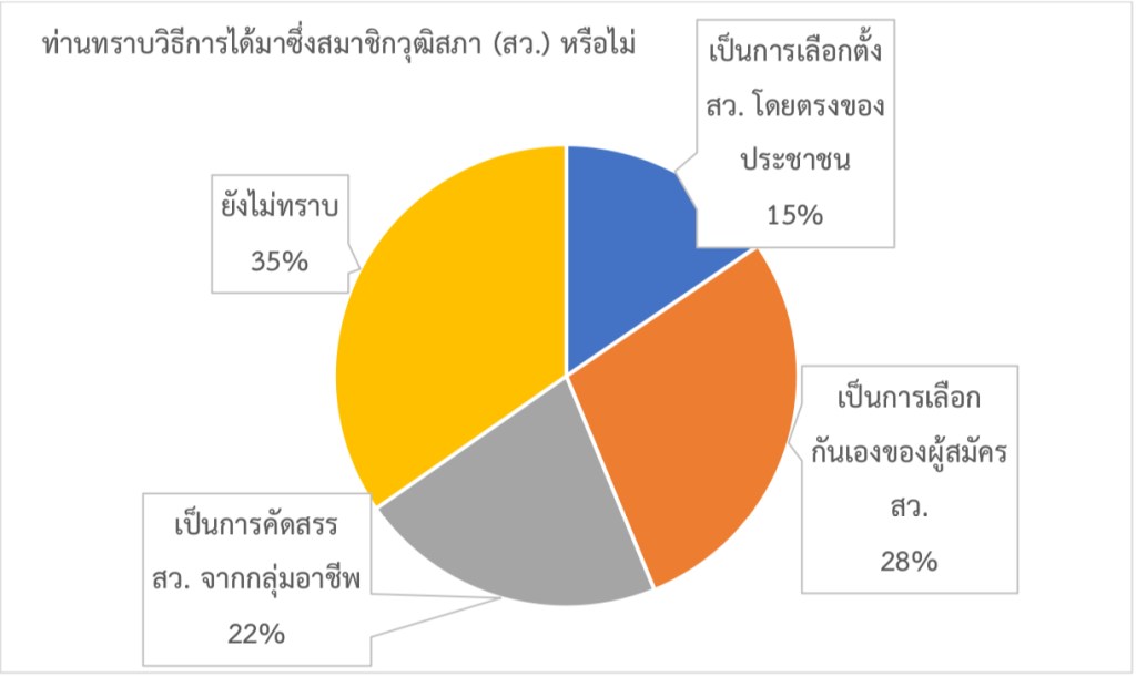 เมื่อสอบถามกลุ่มตัวอย่างว่า “ท่านทราบวิธีการได้มาซึ่งสมาชิกวุฒิสภา (ส.ว.) หรือไม่?” ผู้ตอบแบบสอบถาม เพียงร้อยละ 28.3 เท่านั้นที่ระบุได้ถูกต้องว่า “เป็นการเลือกกันเองของผู้สมัคร” ในขณะที่ผู้ตอบร้อยละ 21.5 ยังเข้าใจว่าการได้มาซึ่ง ส.ว. รอบนี้เป็นการ “คัดสรร ส.ว. จากกลุ่มอาชีพ” และผู้ตอบ ร้อยละ 15.5 เข้าใจว่าเป็นการเลือกตั้ง ส.ว. โดยตรงของประชาชน ยิ่งไปว่านั้น ผู้ตอบ ร้อยละ 34.7 ระบุว่า ยังไม่ทราบวิธีการได้มาซึ่ง ส.ว. ชุดใหม่