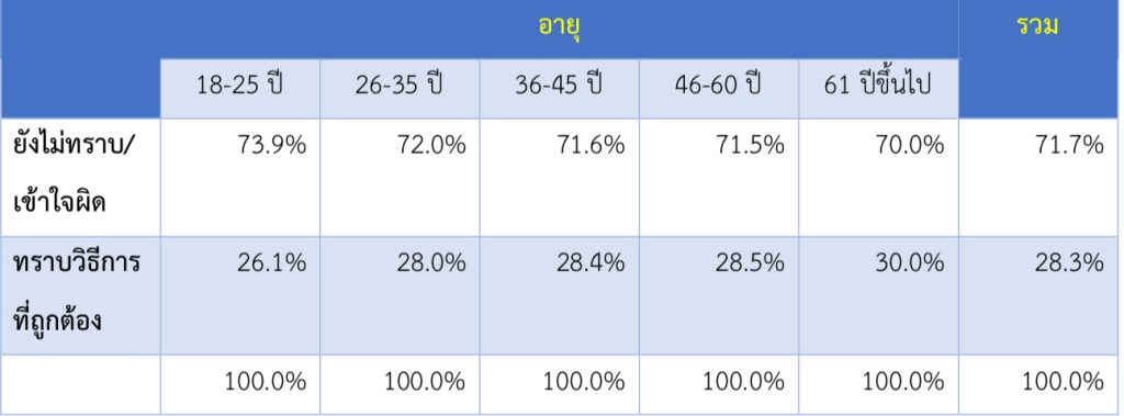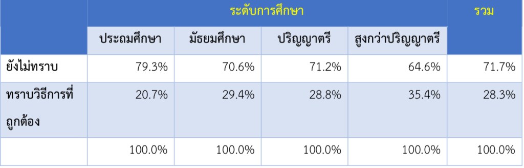 3. ผู้ตอบที่มีระดับการศึกษาสูงกว่าปริญญาตรีเป็นกลุ่มที่ระบุว่าทราบแล้วมากที่สุด คิดเป็นร้อยละ 92.8 ในขณะที่ผู้ตอบที่มีการศึกษาระดับประถมศึกษาเป็นกลุ่มที่ยังไม่ทราบมากที่สุด คิดเป็นร้อยละ 35.9